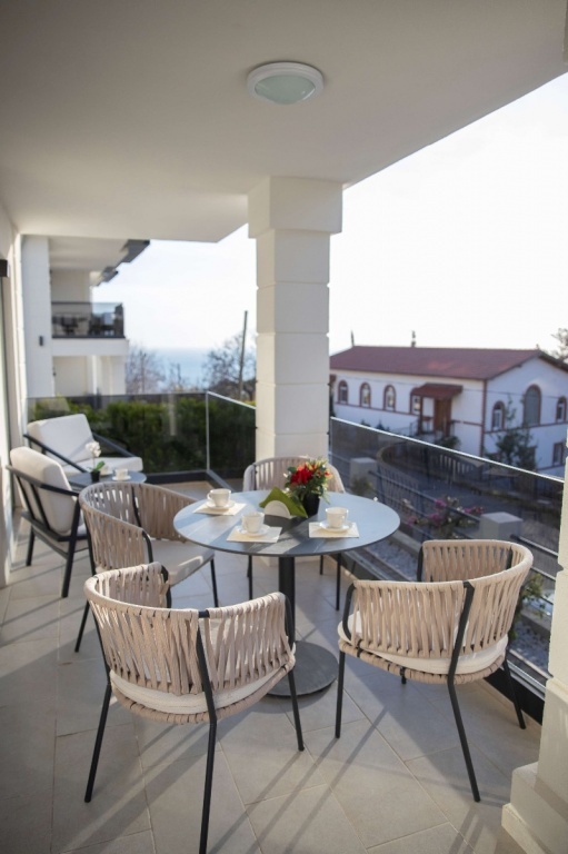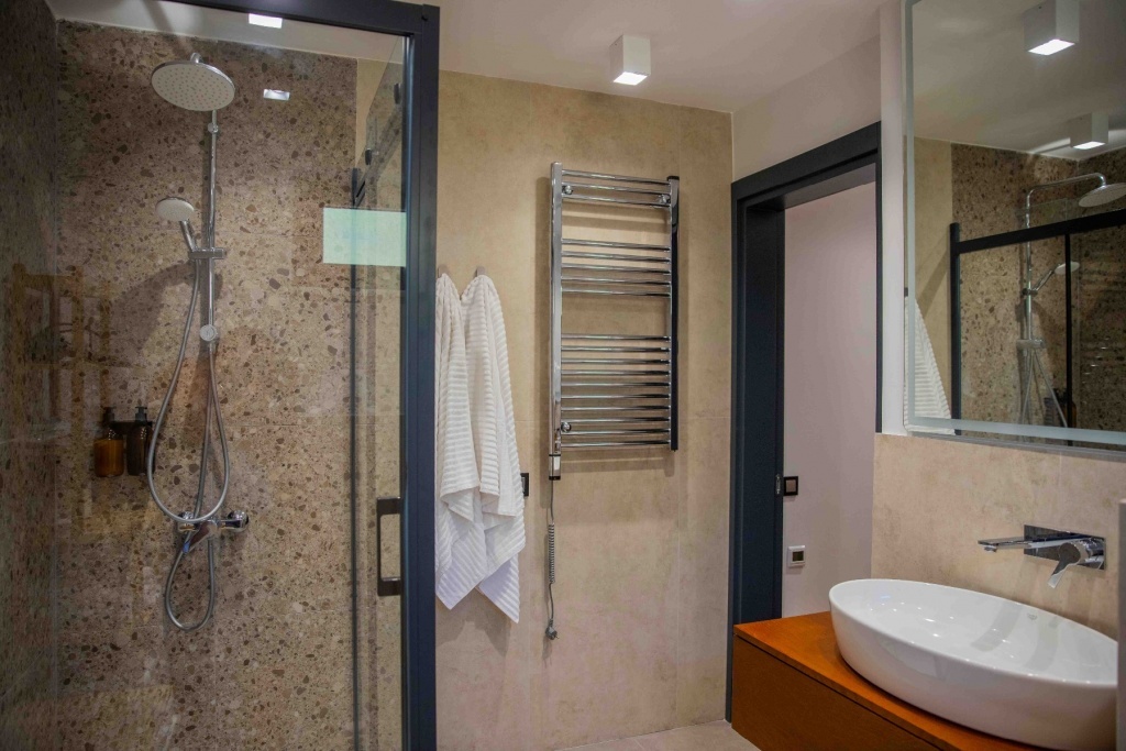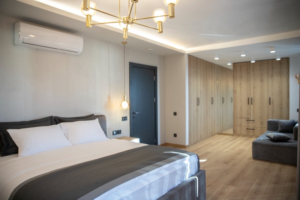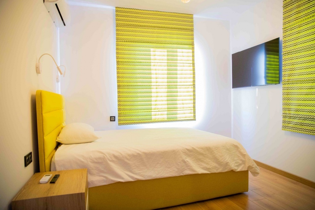 Вилла рассчитана на 5 гостей. У нее отдельный вход, кондиционер, гостиная, две спальни и ванная комната с душем и феном. Кухня полностью оборудована: есть плита, холодильник, посудомоечная машина, посуда. На террасе с видом на море можно отдохнуть. Также в доме есть стиральная машина и телевизор с плоским экраном и кабельным телевидением. В апартаментах три кровати: односпальная и двуспальная, а также раскладное спальное место.